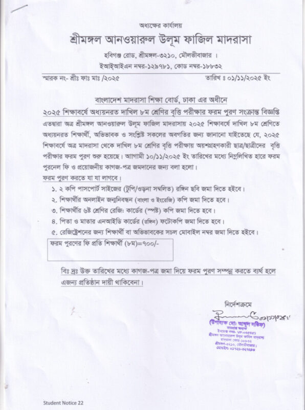 ২০২৫ সনের দাখিল পরীক্ষার ফরম পুরণের নোটিশ
