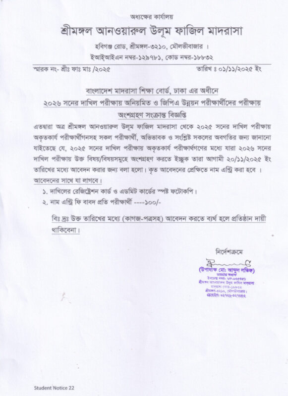 ২০২৬ সনের দাখিল পরীক্ষায় ানিয়মিত ও জিপিএ উন্নয়ন পরীক্ষার্থীদের পরীক্ষায় অংশগ্রহণ সংক্রান্ত বিজ্ঞপ্তি